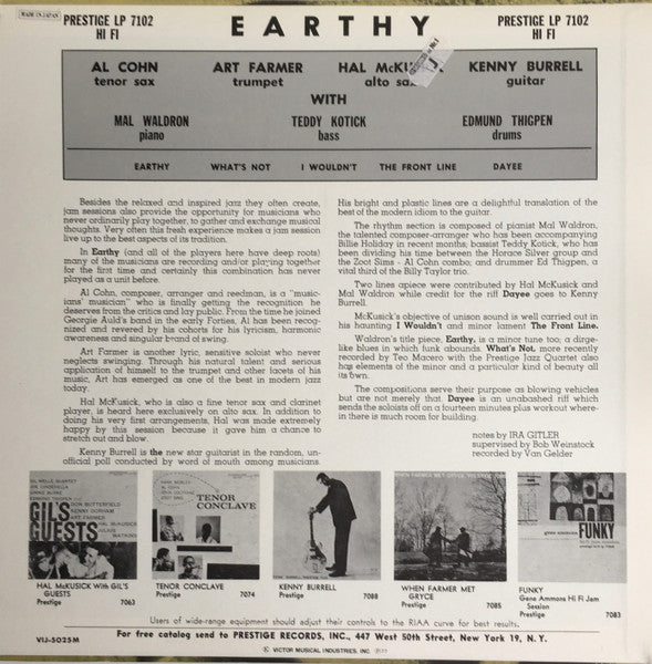 The Prestige All Stars - Earthy (LP, Album, Reissue, Mono) - Very Good Plus (VG+) / Fair (F)