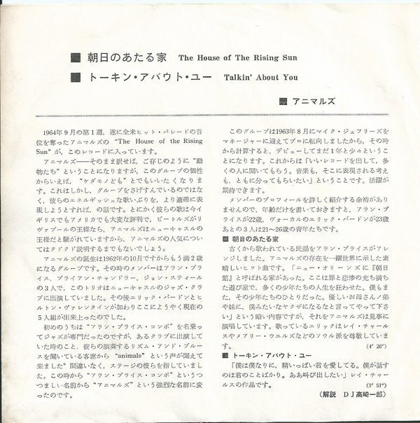 The Animals - 朝日のあたる家 = The House Of The Rising Sun (7", 45 RPM, Single) - Very Good (VG) / Very Good (VG)