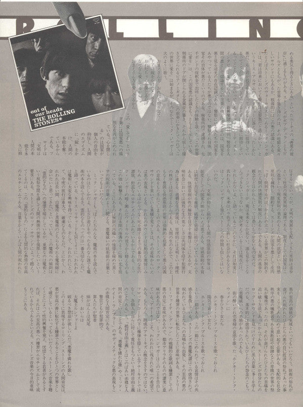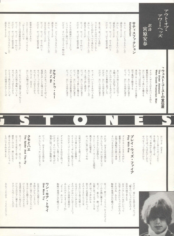 Different track order to most London & Decca releases. Includes an A4 size 8-page booklet. Catalog number "LAX 1005" appears on obi, booklet, front and back cover, the one with hyphen "LAX-1005" appears on center labels. "(I Can't Get No) Satisfaction" and "I'm Alright" are titled as "Satisfaction" and "I'm All Right" on back cover.Recorded in Hollywood, Chicago, London