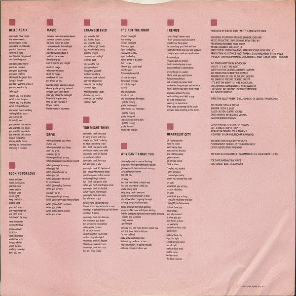 Comes with obi, inner sleeve and japanese lyrics sheetAll songs © 1983 Ric Ocasek except B2 © 1983 Ocasek/Greg Hawkes.