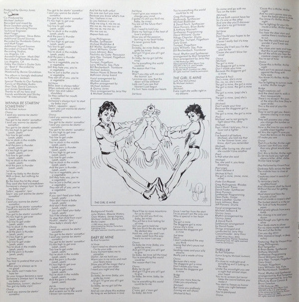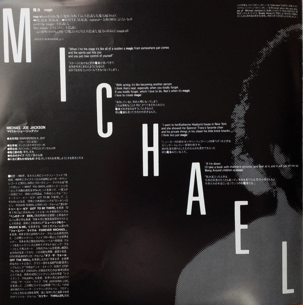 No co-production credit for MJ on rear of sleeve (see here for version with credit: [r=593997])Issued with obi in gatefold sleeve with 2 inserts: a glossy 10-page fold out booklet + single-page double-sided black and white Japanese information sheet. Last 4 pages of the 10-page booklet fold out into a double-sided poster of MJ (standing in purple tracksuit/reclining in white suit with tiger cub).