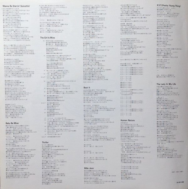 No co-production credit for MJ on rear of sleeve (see here for version with credit: [r=593997])Issued with obi in gatefold sleeve with 2 inserts: a glossy 10-page fold out booklet + single-page double-sided black and white Japanese information sheet. Last 4 pages of the 10-page booklet fold out into a double-sided poster of MJ (standing in purple tracksuit/reclining in white suit with tiger cub).