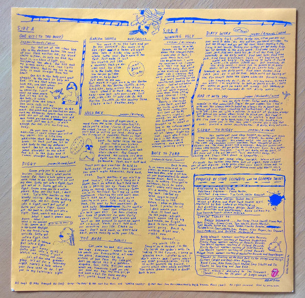 Pink-lined sleeve comes in red shrink wrap with: two hype stickers to front; a 4-page insert with liner notes in Japanese, lyrics in English and Japanese, and Mark Marek's "Dirty Workout" comic strip; a merchandise leaflet/order form; a small CBS/Sony reply card; and a sheet of 10 Rolling Stones "lips and tongue" logo stickers.All songs © 1986 Promopub B.V. (PRS) except A5 © 1983 Half Pint Music and A3 © 1963 Marc-Jean Music & Keymen Music