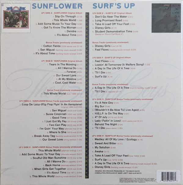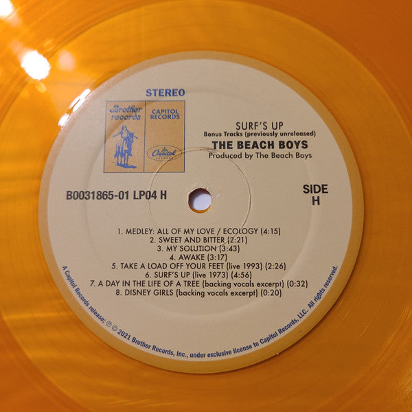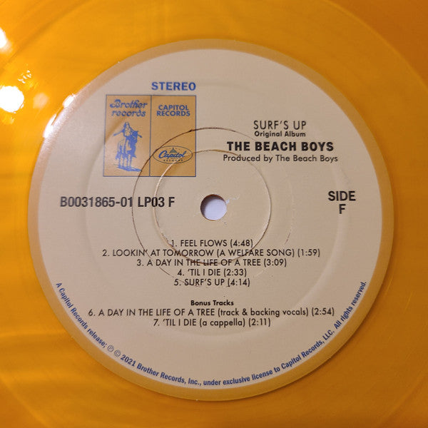 'Surf's Up' (Sides E & F) and 'Surf's Up Bonus Tracks' (Sides G & H) are pressed on yellow translucent vinyl.