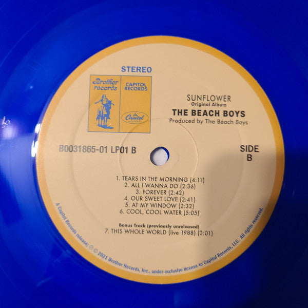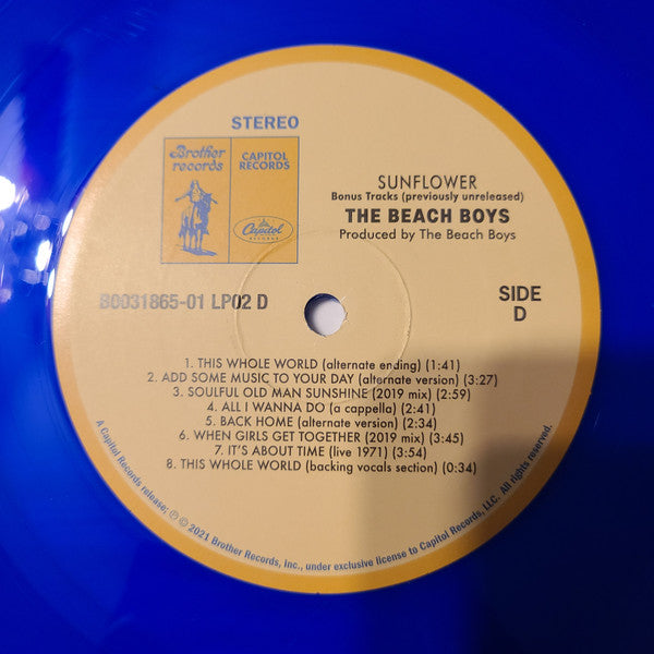 'Sunflower' (Sides A & B) and 'Sunflower Bonus Tracks' (Sides C & D) are pressed on blue translucent vinyl.