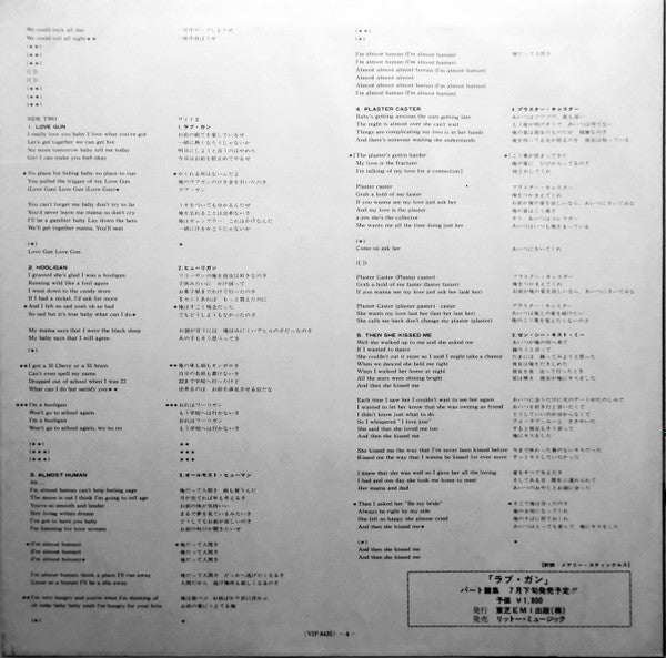 The inscription on the last page of the insert at the bottom right: 「ラブ・ガン」パート譜集7月下旬発売予定!!予価¥1,800発行東芝EMI出版(株)発売リットー・ミュージック ("Love Gun" Part Score Collection Scheduled to be released in late July !! Price ¥ 1,800 released Toshiba EMI Publishing Co., Ltd. released Rittor Music)