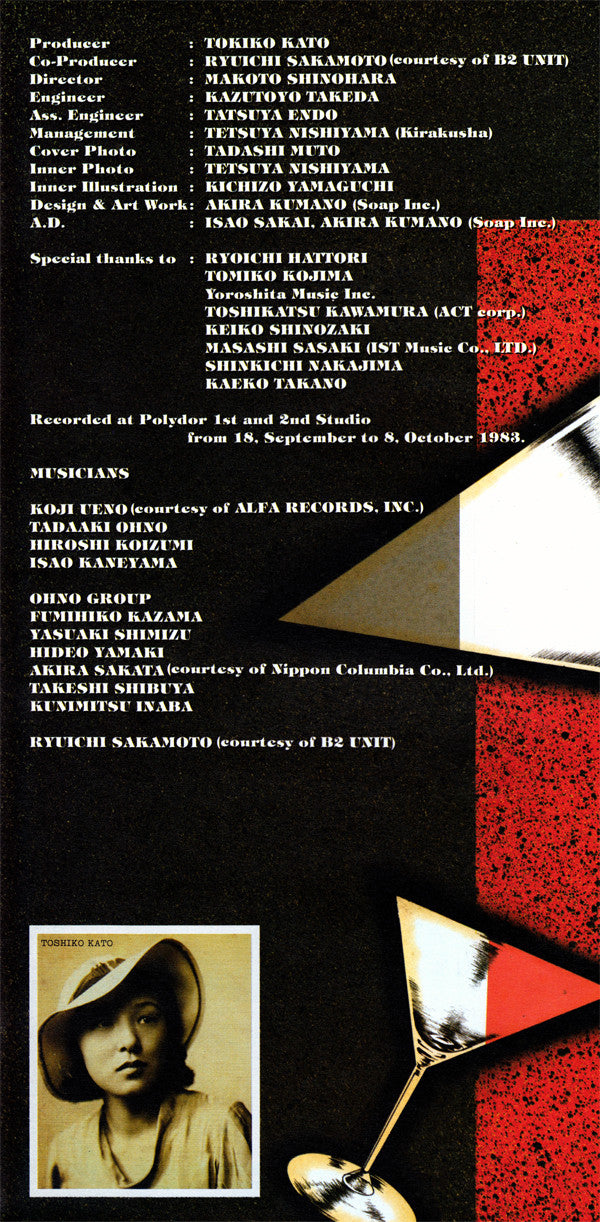 Recorded at Polydor 1st and 2nd studio from 18 September to 8 October 1983.Special Thanks To: 服部良一, 小島美子, ヨロシタミュージック, 川村年勝 (アクト・コーポレーション), 篠崎恵子, 笹木稚司 (イストミュージック), 中島新吉, 高野香枝子