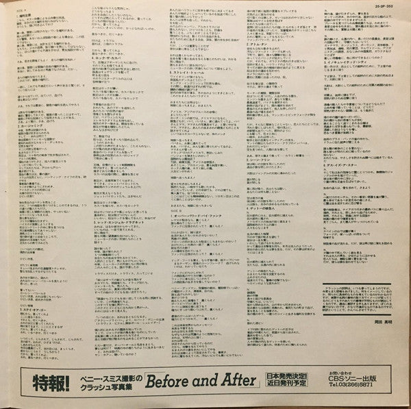 Includes poster. Obi indicates "Poster Included" (ポスター付) in Japanese.Obi and 4-panel folded insert with Japanese lyrics translation and "Before and After" book ad printed on the back.