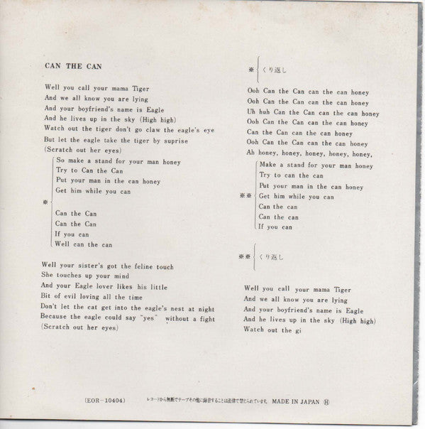 Released with long 3 x 7" record fold-out poster sleeve with long bio. in Japanese and lyrics to the title track in English.First catalogue number on insert and labels, 2nd on labels only.