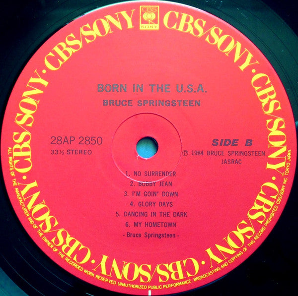 First Japanese issue of the album, the difference being in the blue Japanese title lettering on the obi as opposed to the black Japanese title lettering on the second issue, and the artist name BRUCE SPRINGSTEEN at the top of the obi as opposed to the album title BORN IN THE USA on the 2nd issue obi: Release-8361391.