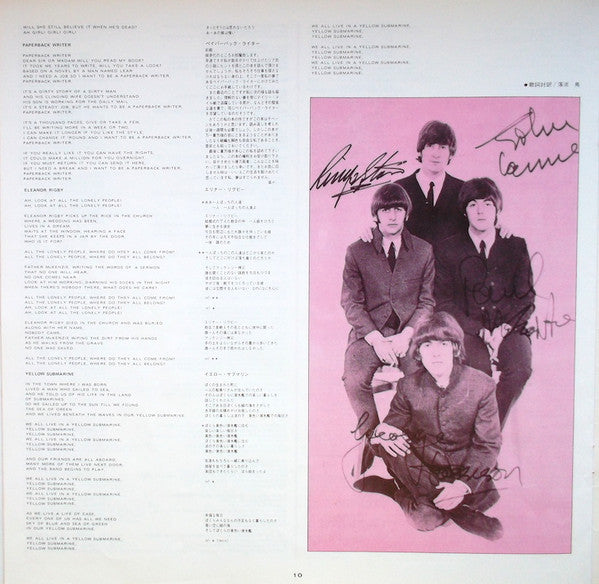 2nd "EMI Musical Industries Ltd" issue with ¥4,000 price on obi & back cover. Gatefold cover came with obi, red inner sleeves with lyrics in english, 16 page booklet in english & japanese (same front/back cover as the LP), 12 page Beatles Discography 1962-1966, and poster.The words "Mfd. by TOSHIBA MUSICAL INDUSTRIES LTD. in Japan" was printed. Publisher's name and "(P) 196X" statement were printed on the label.