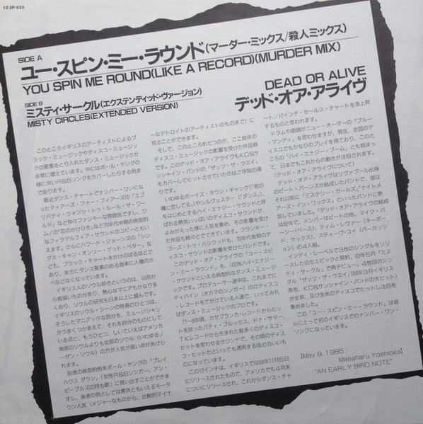 Dead Or Alive - You Spin Me Round (Like A Record) (Murder Mix) = ユー・スピン・ミー・ラウンド (Vinyl, 12", 45 RPM, Single) Good Plus (G+) / Very Good (VG)