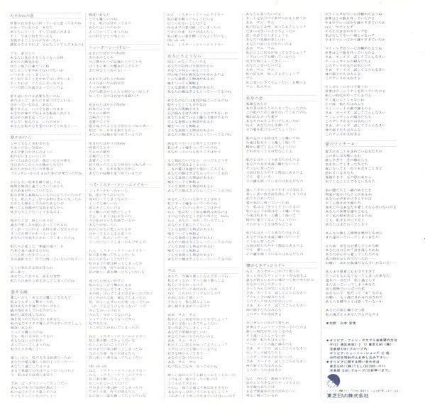 Comes with an obi, double-sided insert in Japanese, and printed inner sleeve with lyrics and credits in English.[From back cover]