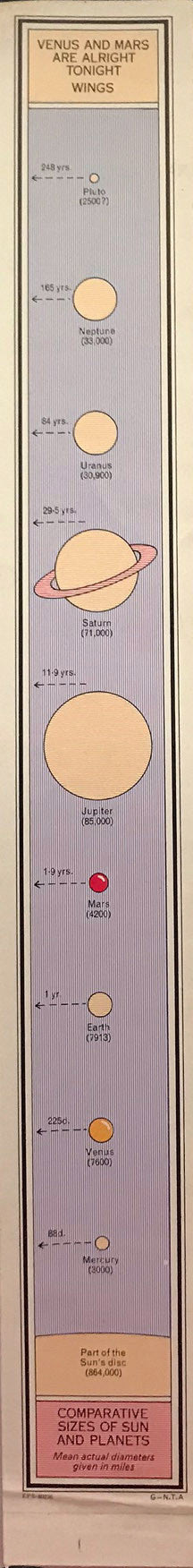 Semi-gloss gatefold cover with orange obi, a 4-page insert with Japanese and English tracklistings, track times, Japanese language liner notes and Japanese lyrics to songs. Also came with inner sleeve, two fold-out posters, a 'Venus And Mars Are Alright Tonight' round sticker on the front cover and a 'Comparative Sizes Of Sun And Planets' strip sticker.Obi has Capitol & MPL logos in green at bottom, similar to [r=18397978], however, on side B labels, tracks B3 (Medicine Jar) and B7 (Crossroads Theme) have writing credits, which [r=18397978] does not. These two pressings have Label-314382 © and ℗.