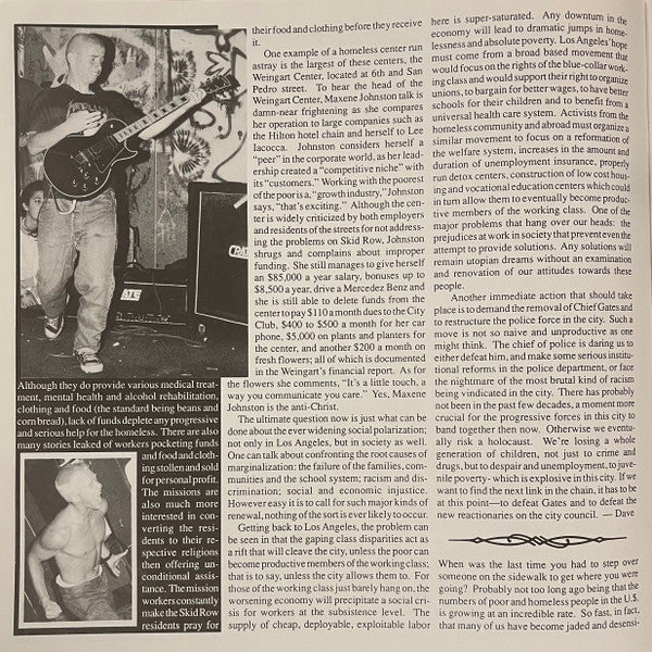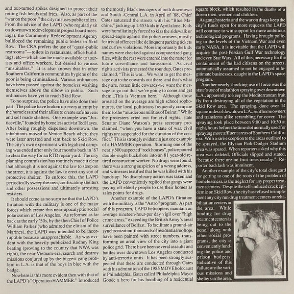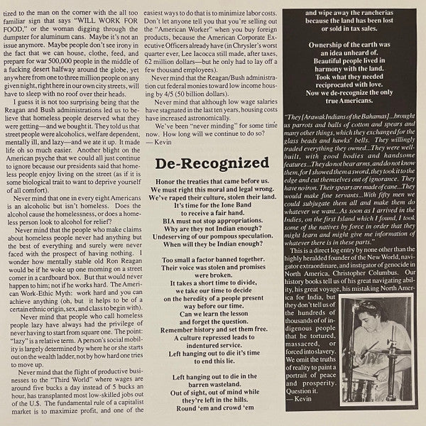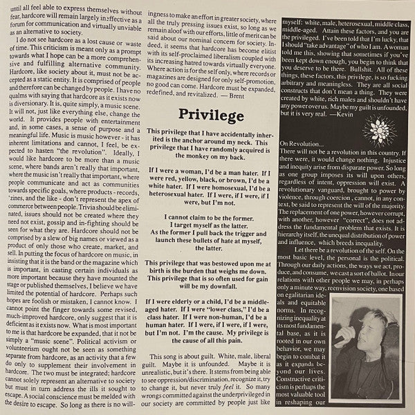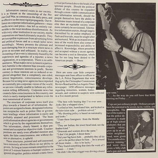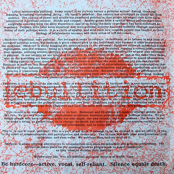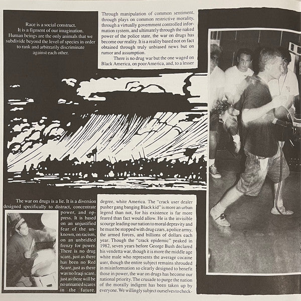 The LP comes in a big 20 page booklet with lyrics, pictures and liner notes and a 10"x10" insert which contains an article from Ebullition Records on one side and a text from Dreaming The Dark by Starhawk on the other.