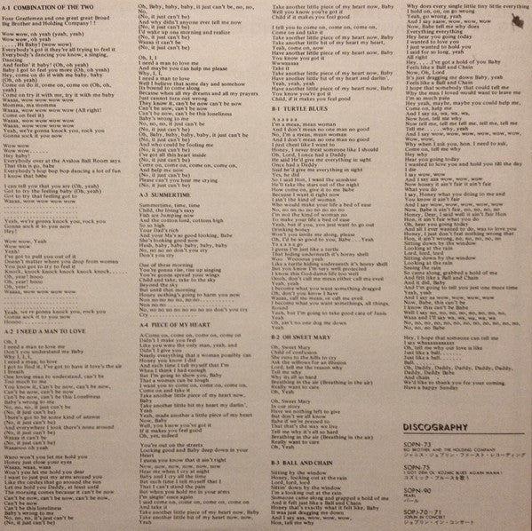 Comes with obi, 10″ lyrics insert and deluxe CBS plastic inner sleeve.Live material recorded at Bill Graham's Fillmore Auditorium. Turtle Blues "Vibes" courtesy of Barney's Beanery.