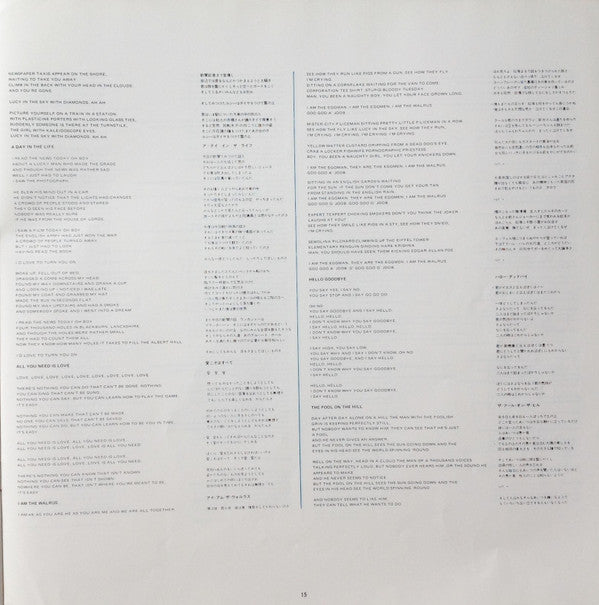 Gatefold sleeve with printed inner sleeves with lyrics,1 poster and 2 additional booklets (1 discography + 1 detailed chronology & lyrics with Japanese translation)A1 to C1, C3 to C6, D2, D5 to D7: Northern Songs