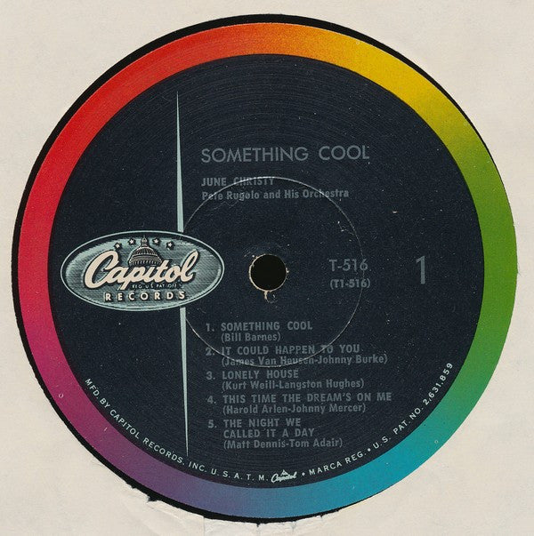 "Something Cool" has been newly recorded and released in 1960 with a new front jacket.This is the 1960 mono issue on the second rainbow label. This rainbow label is issued 1960 with the Capitol logo at 9 o'clock position and a vertical spire replacing earlier "Long Playing / High Fidelity" text.