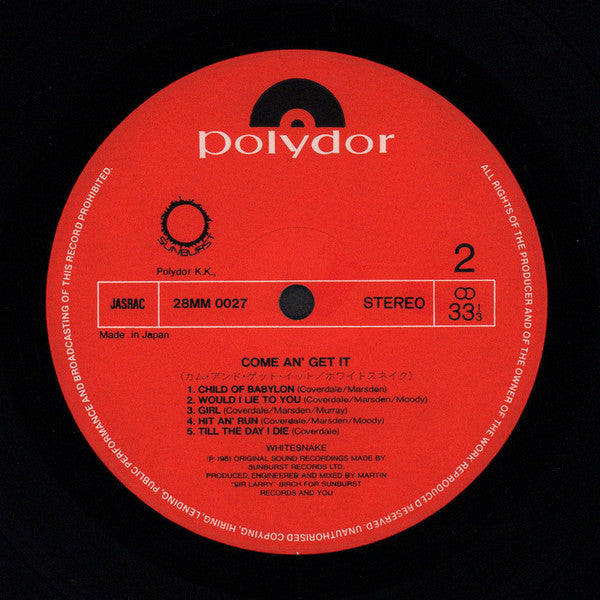 Whitesnake - Come An' Get It (Vinyl, LP, Album) Very Good Plus (VG+) / Good Plus (G+)