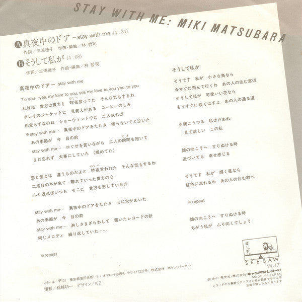 Miki Matsubara - 真夜中のドア/Stay With Me (Vinyl, 7", 45 RPM, Single, Stereo) Very Good Plus (VG+) / Very Good Plus (VG+)