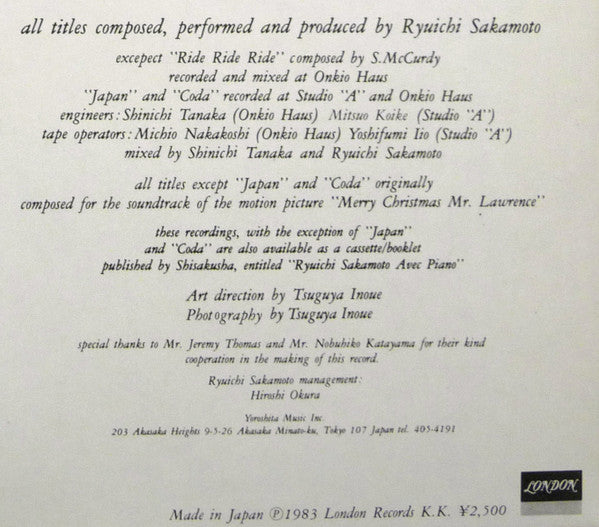 These recordings, with the exception of "Japan" and "Coda" are also available as a cassette/booklet published by Shisakusha, entitled "Ryuichi Sakamoto avec Piano"