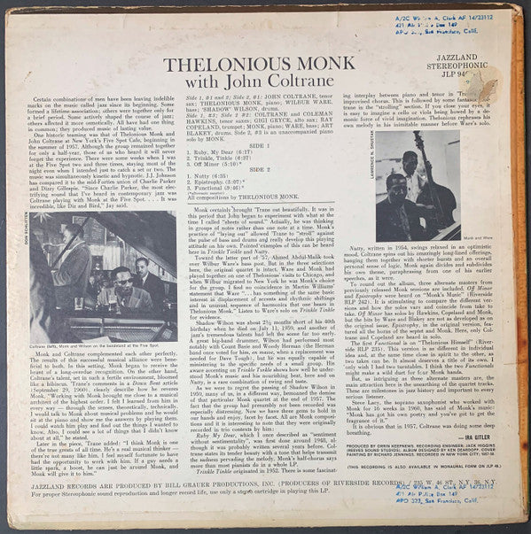 Recorded In New York; 1957-58.Track B3 is unaccompanied piano solo by Monk.