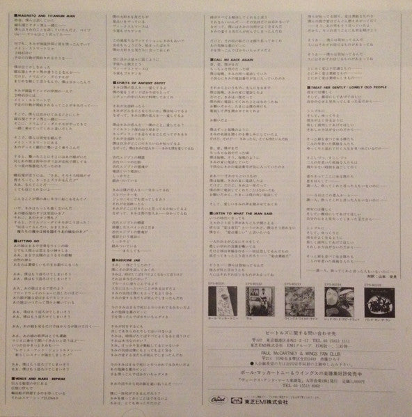 Came with Two fold out posters, a 'Venus And Mars Are Alright Tonight' round sticker and a 'Planets' strip stickerObi has Capitol & MPL logos in green at bottom. Another similar issue has them in black: [r=4019995]