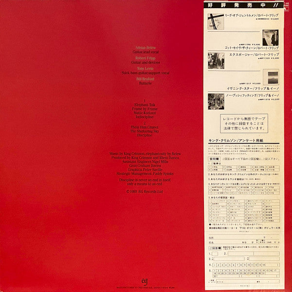 Matte, non-embossed cover with wider obi compared to the other original Japanese pressing with an embossed cover Release-2737249. There is also a 1-page insert with Japanese and English tracklistings, Japanese language liner notes from a July 15 1981 telephone interview with Robert Fripp and English lyrics to the 3 songs on the album.On obi and insert it states: ディシプリン / キング・クリムゾンの復活 = Discipline / The Return Of King Crimson.
