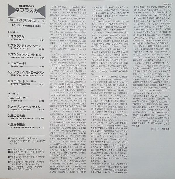 Japanese 3rd issue of Nebraska with black vertical obi - "25AP 2440" in white lettering on upper left of obi (does NOT have "BRU" lettering to match up with the front cover image).Barcode and Other Identifiers