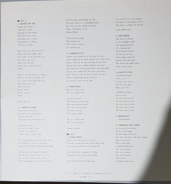 1978 Japanese first release by Nippon Phonogram with Vertigo label. It comes with an obi strip, a printed inner sleeve bag parallel to the UK & USA editions and a Japan only insert sheet with the track listing/durations, liner notes by Kensho Onuki and Masa Itoh along with the English lyrics(obviously transcribed by ear).The black vinyl record is translucent