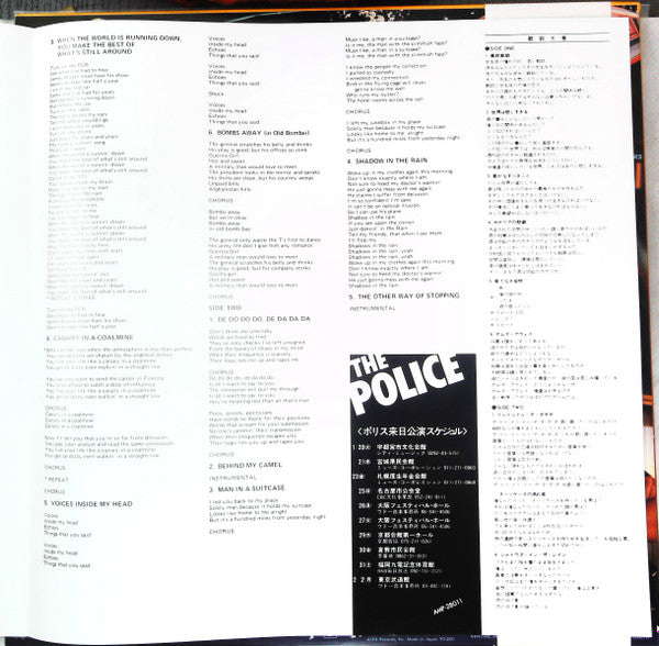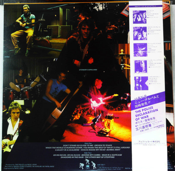 - "THE POLICE" on front of cover is larger (and "3D with shadow") compared to [r=3409522]. Also the color of the sleeve is more bright (more orange).- This release has the same rather narrow yellow/lilac obi as [r=3409522].