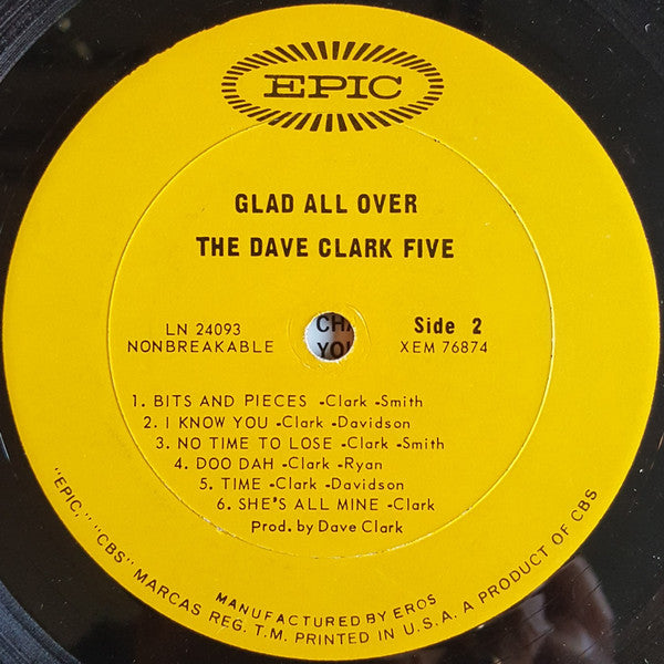 Label Variation: "Prod. by Dave Clark" below song lists and "MANUFACTURED BY EROS" and "CBS" in rim text on labels.Similar to Release-7732394 but without pressing plant identifier and with '5' plant identifier before registration info in lower right of back cover instead of '9' outside the border line.