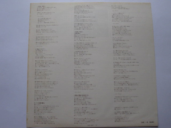 Gatefold sleeve. White label promotional copy; Price Y2,500; Pressed by Victor Musical Industries, Tokyo, Japan.Includes Japanese lyric insert.