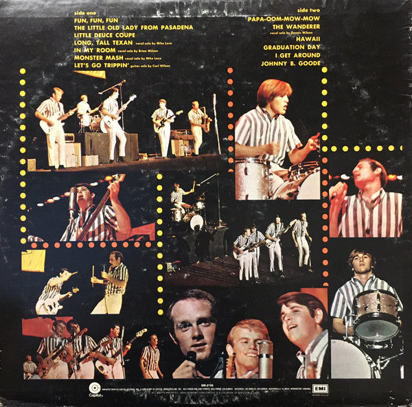 "This is The Beach Boys' first "live" album. Here are the great songs, the unbelievable excitement of an actual Beach Boys concert - before thousands of shouting, screaming Beach Boys fans!" printed on front cover.