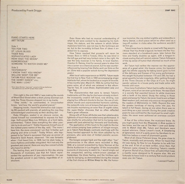 Art Tatum - Piano Starts Here (LP, Compilation, Reissue, Mono) - Very Good Plus (VG+) / Very Good Plus (VG+)