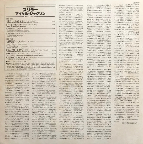 Blue obi features a gold star and black box; the gold star advertises "The Girl is Mine", "Billie Jean" and "Beat It" as being 3 major hit singles, thus indicating a repress.