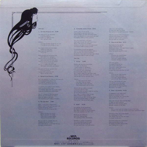 Matte gatefold with dark blue obi with light blue text and image and glued single-page insert with tracklistings in Japanese and English and Japanese language liner notes.Track times on insert and back cover do not match. Track times entered are those depicted on the insert. Lyrics to songs on back cover.