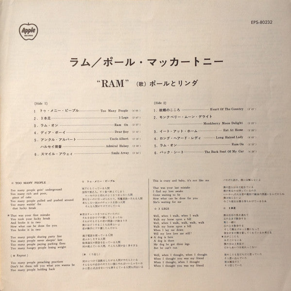 Paul & Linda McCartney - Ram = ラム (LP, Album, Stereo) - Very Good Plus (VG+) / Very Good Plus (VG+)