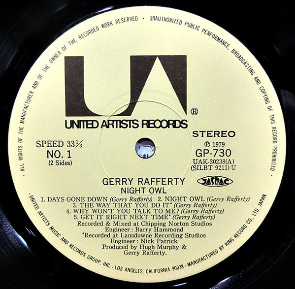 Gerry Rafferty - Night Owl (LP, Album) - Near Mint (NM or M-) / Very Good Plus (VG+)