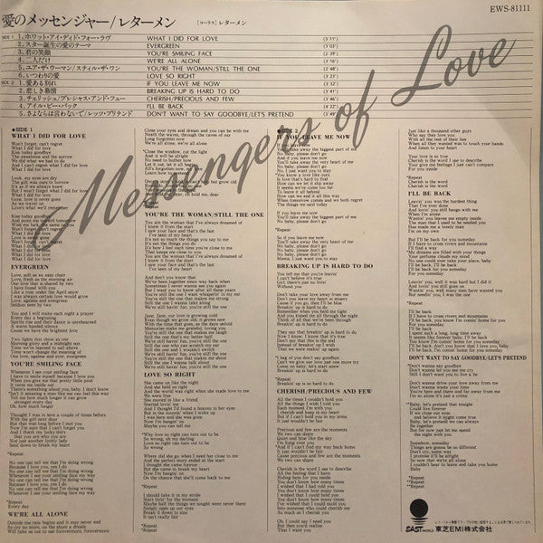 Japanese pressing which might have been produced for promotional purposes.Looks to be virtually identical to the 1979 Lettermen album "Love Is..." with the exception of a different track order and the additional track "You're The Woman/Still The One."