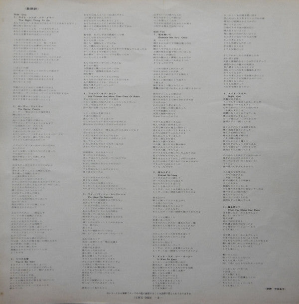 No Obi. With Insert. (foxing stains)With Lyrics Inner Sleeve. (foxing stains) Record has hairlines and slight scuffs. Sleeve has foxing stains.