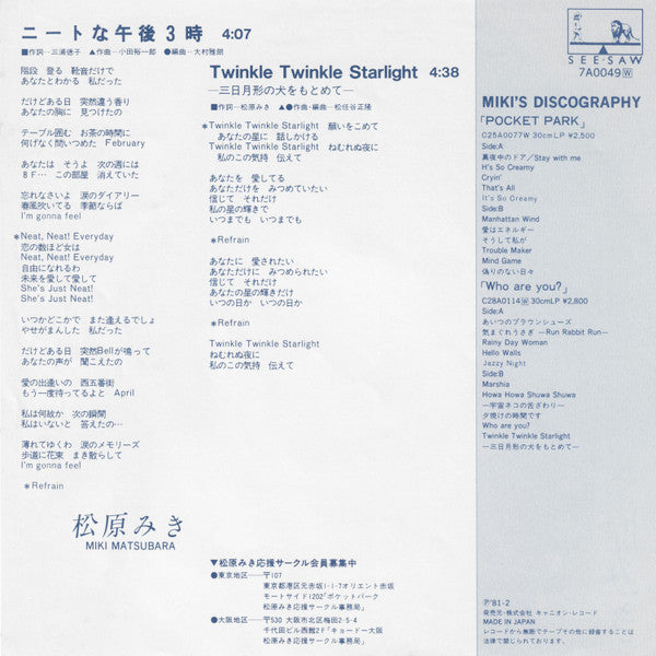 Miki Matsubara - ニートな午後3時 (7", 45 RPM, Single) - Very Good Plus (VG+) / Very Good Plus (VG+)