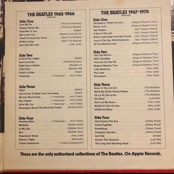 Capitol, Jacksonville pressing, as identified by a "0" in the run-outs.Came with white insert track sheet for both 62-66 and 67-70 albums with "for your information" discography of US Beatles and solo released up to spring 1973.