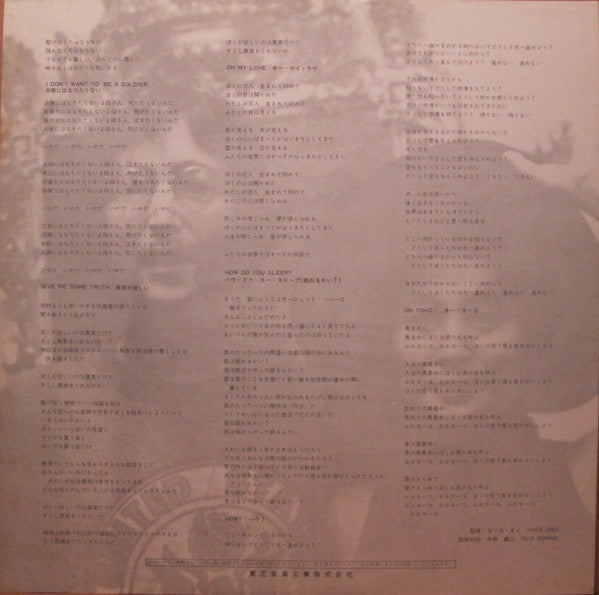 Japanese first issue RED vinyl with obi, custom picture labels, die-cut printed inner sleeve with English lyrics/credits, Japanese lyric insert, postcard, and a large folded poster.Timings shown are from the Japanese insert, and differ slightly from those shown on the printed inner sleeve (which simply reprints the US/UK information with addition of Japanese AP-80370 catalog number.)