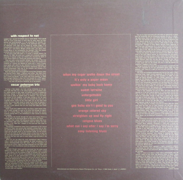 With Respect to Nat is a 1965 studio album by jazz pianist Oscar Peterson, recorded in tribute to Nat King Cole, who had died earlier that year. Peterson sings on all tracks except "Easy Listening Blues". With Respect to Nat is the second album to feature Peterson singing, following Romance: The Vocal Styling Of Oscar Peterson, from 1954. A third, The Personal Touch was released in 1980.(Japanese 12-track stereo LP)