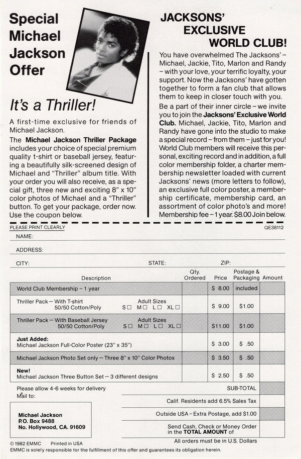 Some copies were stuffed with fan club Thriller merchandise sheet.