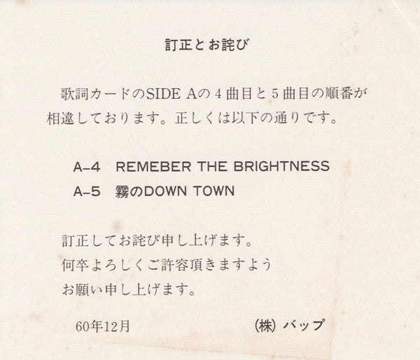 Some copies include a hype sticker to promote the song "ガラスのPalm Tree" [Garasu No Palm Tree].Initial copies were printed with the insert showing Track A4 and A5 as swapped in the tracklist. An apology card was included for the misprint. Later copies were printed with the corrected insert.