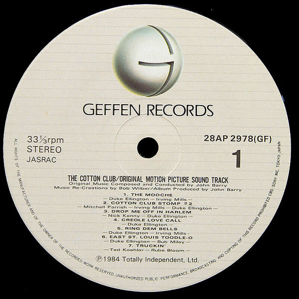 Soundtrack to [a=Francis Ford Coppola] movie "Cotton Club", starring Richard Gere, Gregory Hines, Diane Lane, Lonette McKee, co-starring Bob Hoskins, James Remar, Nicolas Cage, Allen Garfield and Fred Gwynne. Music by John Barry, Director of Photography Stephen Goldblatt, B.S.C., Costumes designed by Milena Canonero, Production Designer Richard Sylbert, Supervising Editor Barry Malkin, Producer Consultant Milton Forman, Co-Producers Sylvio Tabet and Fred Roos, Executive Producer Syson Lovell, Line Producer Barrie M. Osbourne & Joseph Cusumano, Story by William Kennedy & Francis Coppola and Mario Puzo, Screenplay by William Kennedy & Francis Coppola, Produced by Robert Evans. ⓒ 1984 ORION Pictures Corporation.Recorded and Mixed at A&R Recording and Clinton Recording using Sony and Mitsubishi digital recording equipement.