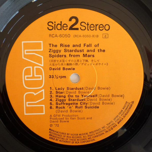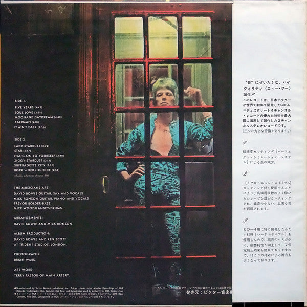 First Japanese issue. The 1972 black/red obi was followed in 1973 by two variations of the "Glam Rock" obi (pink, then orange) and in 1975 by a further "Glam Rock" obi (white/red). 1974 saw a red/black variation of the original obi, followed by a black and pink design in 1976. All of these issues carry the same RCA-6050 catalogue number.The album was recorded at Trident Studios, London, 9 July 1971 - 4 February 1972 using material from the sessions for the previous album 'Hunky Dory' ('It Ain't Easy', July 9, 1971), all other tracks being recorded between November 8, 1971 and February 4, 1972.