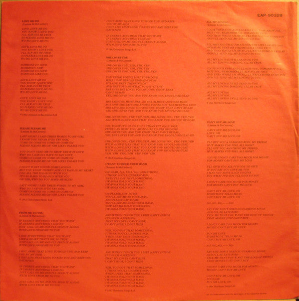 2nd "EMI Musical Industries Ltd" issue with ¥4,000 price on obi & back cover. Gatefold cover came with obi, red inner sleeves with lyrics in english, 16 page booklet in english & japanese (same front/back cover as the LP), 12 page Beatles Discography 1962-1966, and poster.The words "Mfd. by TOSHIBA MUSICAL INDUSTRIES LTD. in Japan" was printed. Publisher's name and "(P) 196X" statement were printed on the label.
